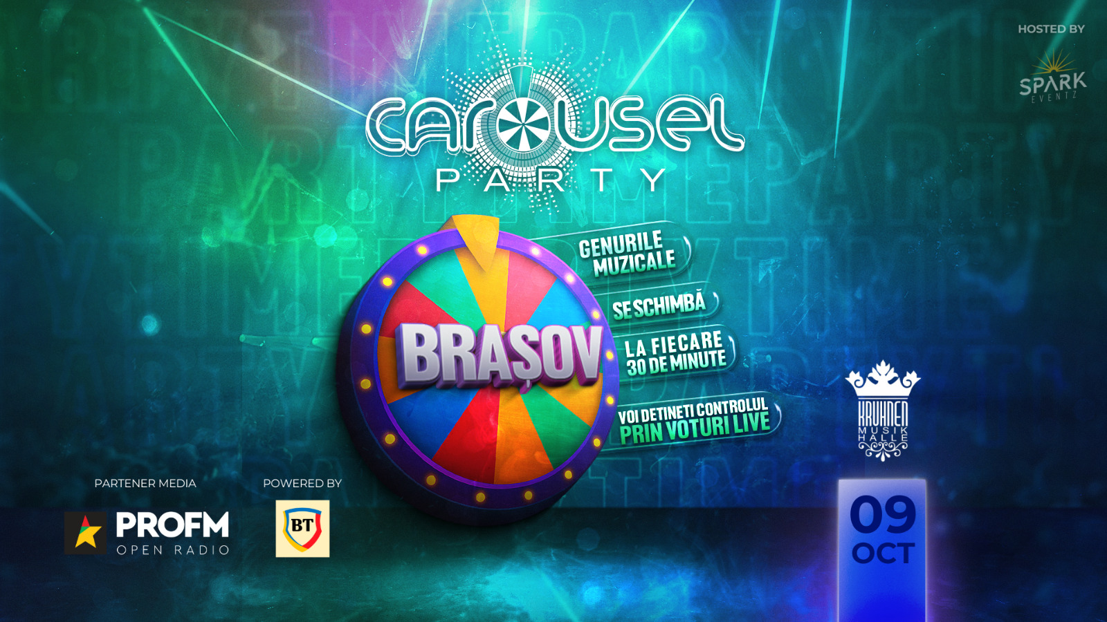 CAROUSEL PARTY is back in town! Pe 9 Octombrie la #Brasov vibe-ul e în mâinile voastre✌🏼🤫 Unicul concept din România unde publicul deține controlul genurilor muzicale, revine in Kruhnen Musik Halle! La fiecare 30 de minute voi sunteți cei care votați următorul gen muzical, LIVE direct de pe telefoanele voastre, scanând un cod QR.